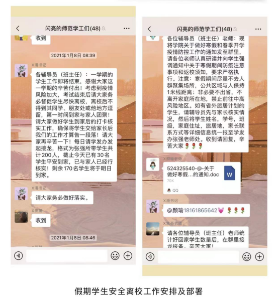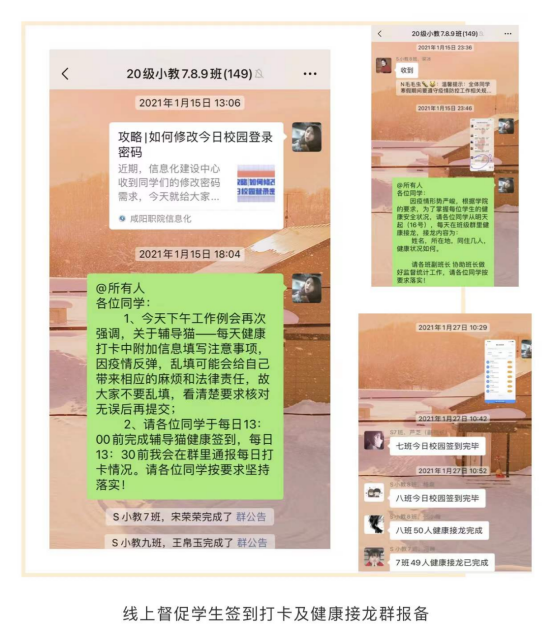 按照“双高计划”建设要求,各位辅导员(班主任)老师化身“线上小卫士”,密切关注离校员工的近况,每天及时督促离校员工按要求完成今日校园“辅导猫”上的签到打卡,同时每天提醒离校员工按时完成群健康接龙,以此及时掌握离校员工的身体状况及所在地。